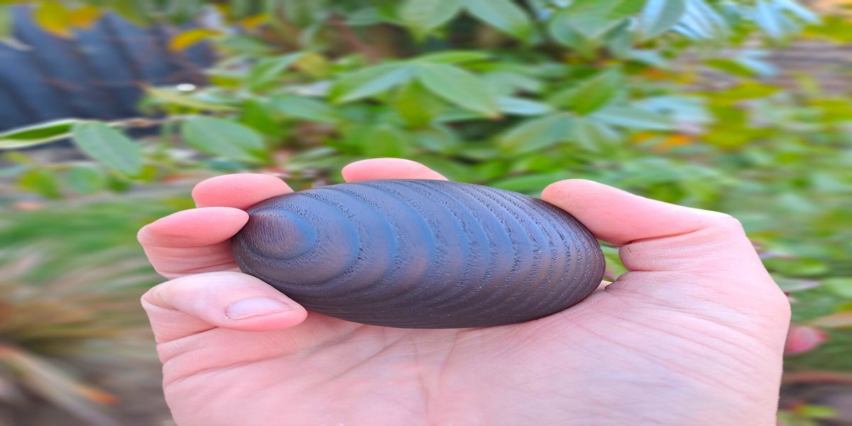 Als basis is een essen houten knuffelkei gebruikt en deze is zwart gebrand en vervolgens uitgeborsteld.