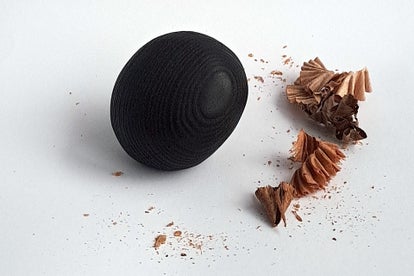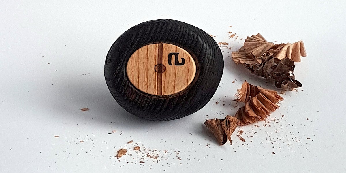 Een Essenhouten knuffelkei, bewerkt een japanse brandtechniek Shou Sugi Ban (Yakisugi).