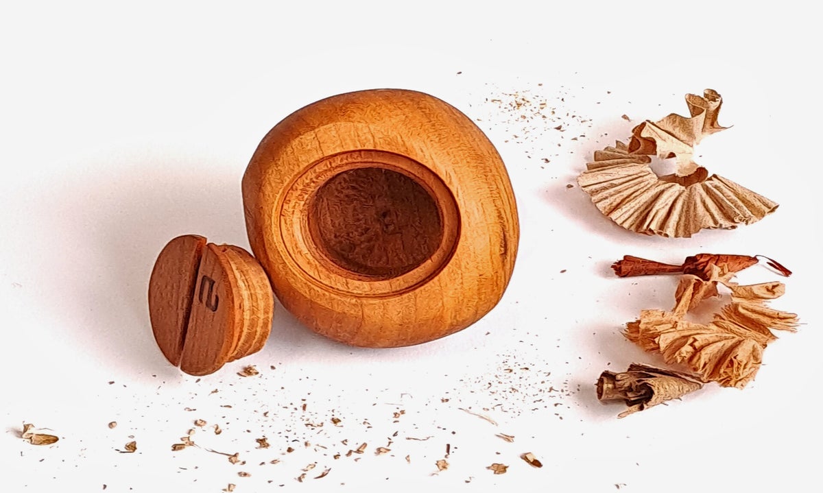 Deze houten knuffelkei is gemaakt van 1 stuk kersenhout en voorzien van een houten schroefbare afsluitdop.