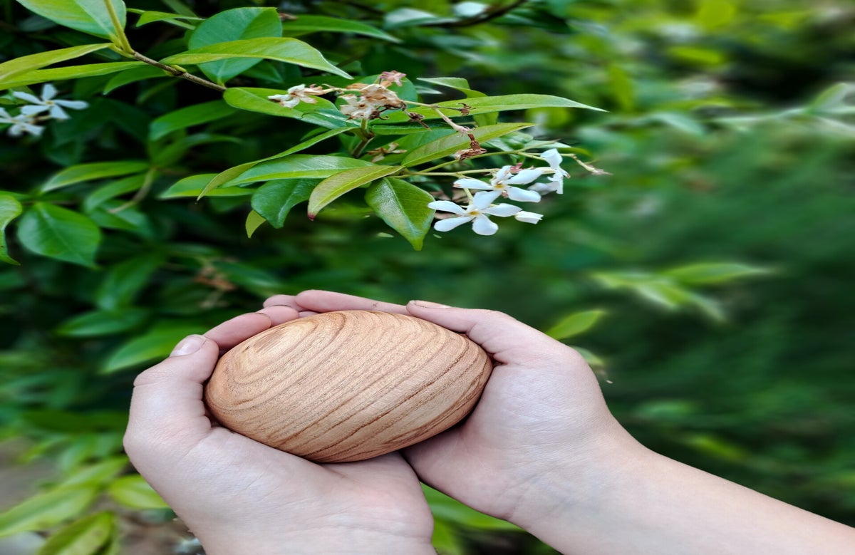 Notenhout straalt rust en elegantie uit. Het heeft een rijke, donkere kleur en voelt vol en stevig aan. Een kei van noten draagt iets van diepgang en wijsheid in zich – als een fluistering van wat belangrijk is.